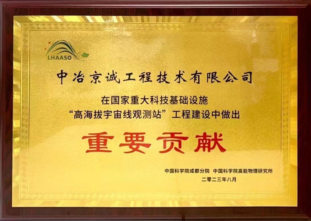 8月25日获悉,国家重大科研基础设施——高海拔宇宙线观测站(LHAASO)工程建设总结会在成都天府宇宙线研究中心隆重举办。中冶京诚作为观测站MD探测器外壳的唯一总包单位荣获“重要贡献”奖。中国科学院院士、中科院高能物理研究所所长王贻芳出席会议并为获奖单位颁奖。